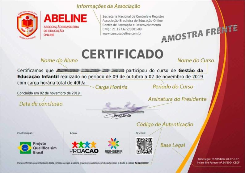 Veja abaixo nosso novo modelo do certificado de conclusão de curso emitido pela ABELINE | Associação Brasileira de Educação Online.